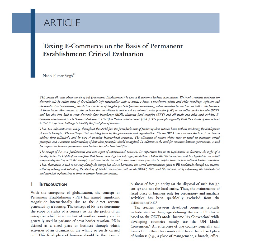 Manoj Kumar Singh, 'Taxing E-Commerce on the Basis of Permanent Establishment: Critical Evaluation', (2014), 42, Intertax, Issue 5, pp. 325-333, https://kluwerlawonline.com/journalarticle/Intertax/42.5/TAXI2014034